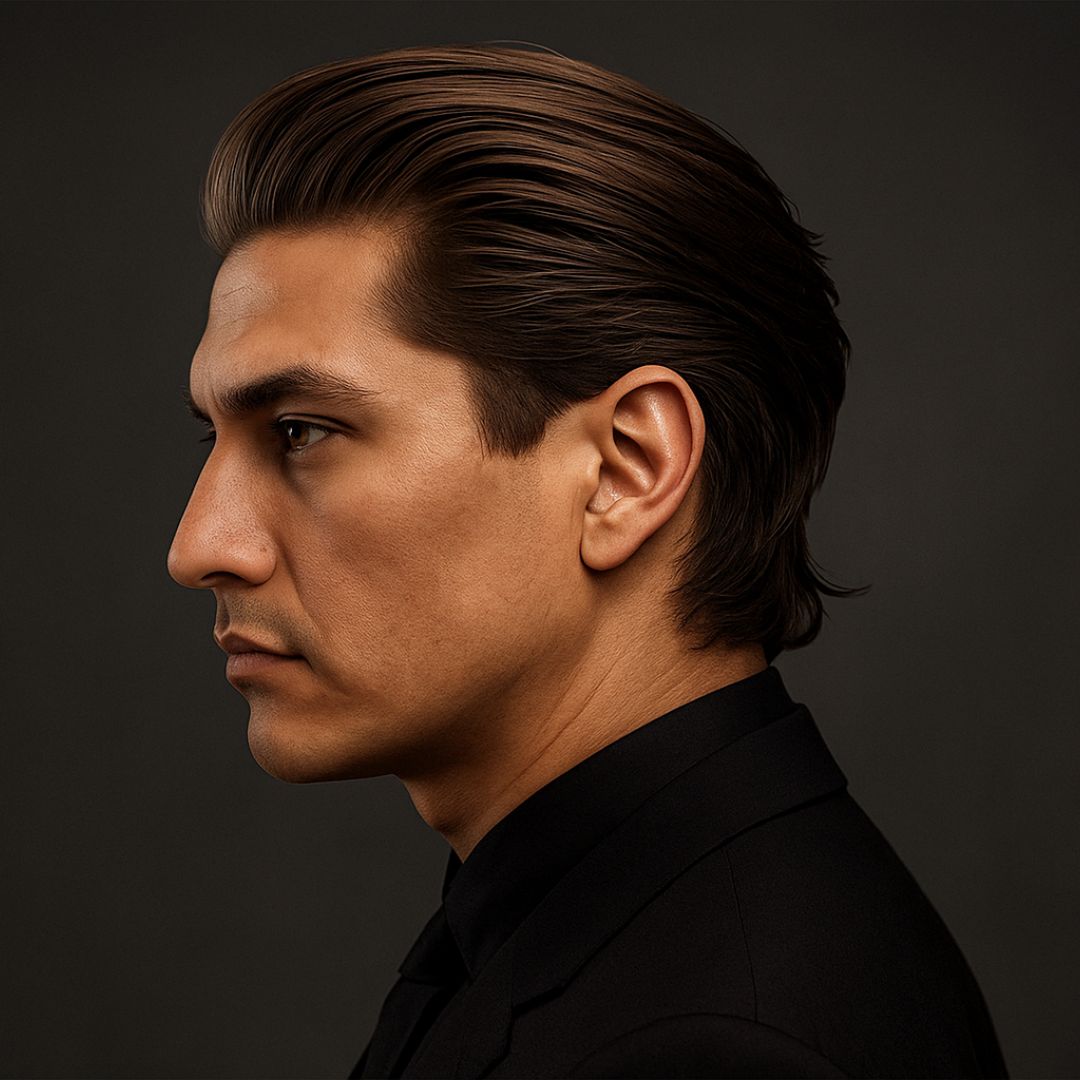 A mature and powerful look: hair brushed back with control, subtle volume, and a polished finish without stiffness. It adds character and is ideal for formal occasions or an elegant daily style.