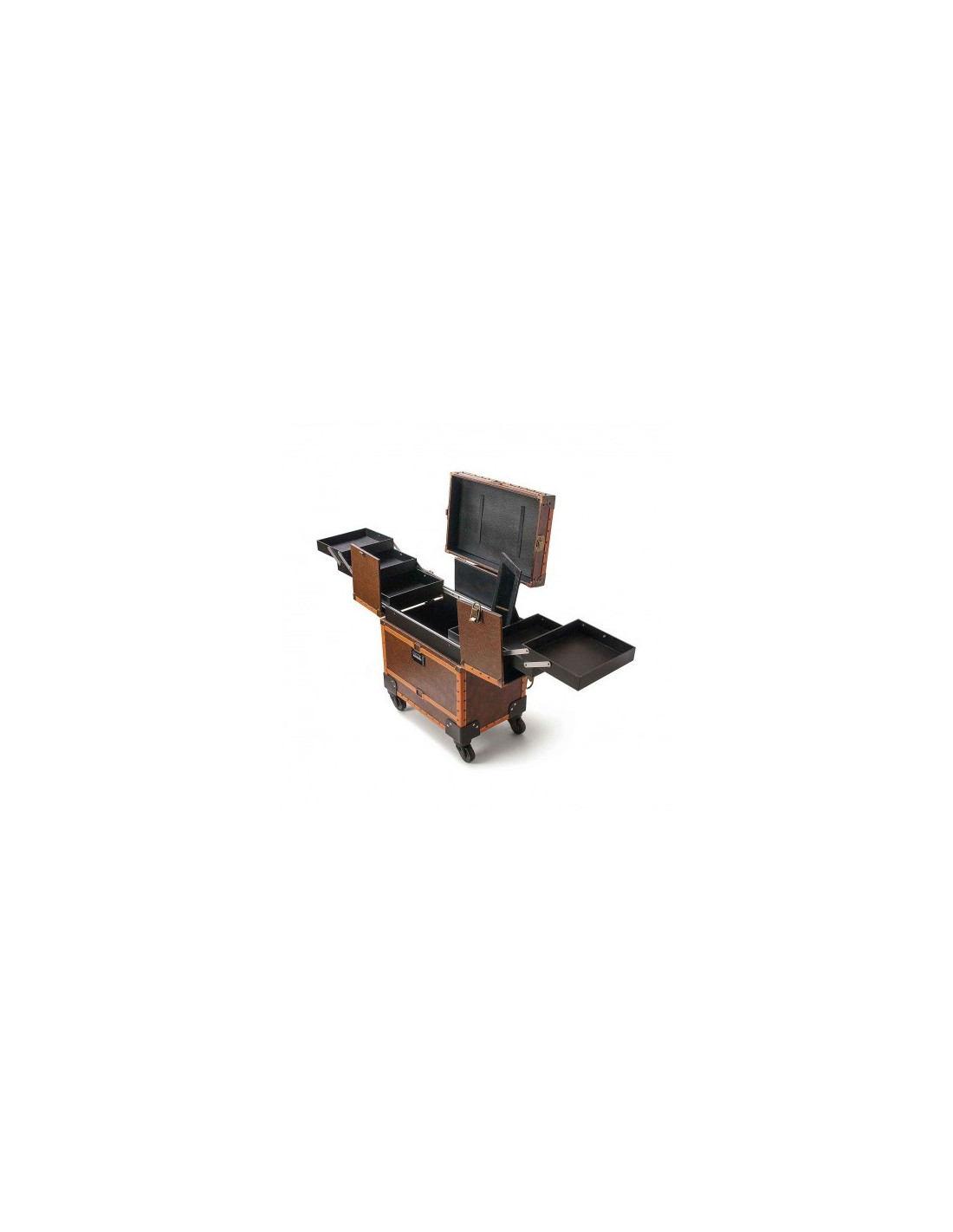 Maletín profesional de estilo vintage con ruedas. La parte superior del maletín se desmonta para facilitar el acceso. Dispone de 6 bandejas extensibles, un amplio espacio interior y un espejo. Asa telescópica de aluminio súper resistente que se extiende hasta una altura de 96 cm. Sus ruedas se deslizan suavemente y sin esfuerzo. Fácil de limpiar. Cierre de seguridad con llave.